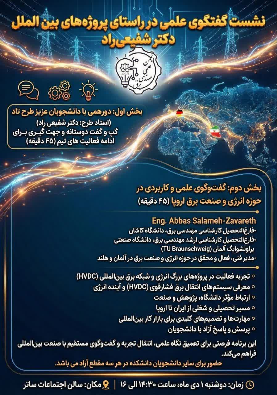 گفتوگوی علمی و کاربردی در حوزه انرژی و صنعت برق اروپا با حضور آقای مهندس عباس سلامهزواره (فارغالتحصیل مهندسی برق، دانشگاه کاشان)